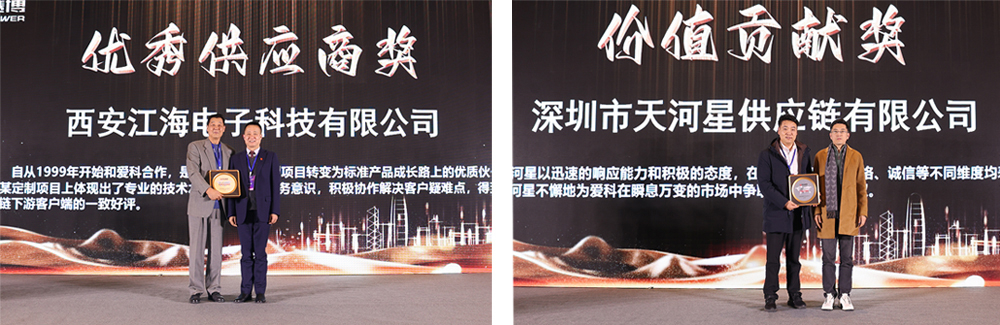 樹深根固,大廈乃穩(wěn)。優(yōu)秀的供應鏈也是愛科賽博枝繁葉茂發(fā)展基礎下的重要根脈之一。此次愛科賽博供應商合作伙伴大會,共評選出了27家優(yōu)秀供應商合作伙伴,在大會現(xiàn)場分別頒發(fā)了“優(yōu)秀供應商獎”、“價值貢獻獎”、“最佳服務獎”、“最佳交付獎”、“戰(zhàn)略合作伙伴獎”。優(yōu)秀供應商代表Wolfspeed、紫光同創(chuàng)、京泉華也在大會現(xiàn)場作了發(fā)言,分享與愛科同行的合作故事,合作經(jīng)驗,及對未來發(fā)展、合作共贏的展望。