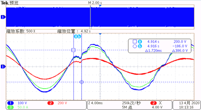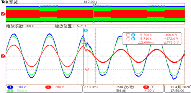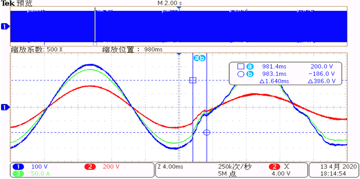 圖一,圖二,圖三,分別是電網電壓在0°,30°,60°下發生暫降,由圖可以看出,當電網發生暫降時,電壓暫降治理設備可快速補償,響應時間均小于3ms。