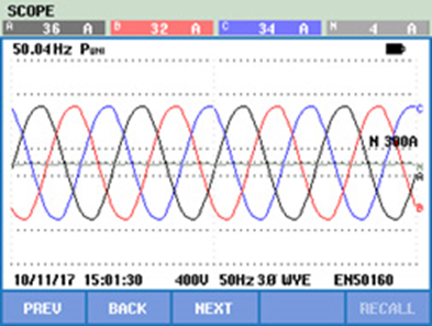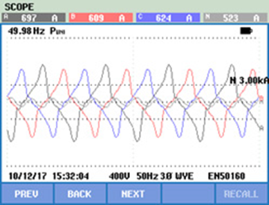 從測試數據看出,變壓器低壓側電流波形發生嚴重畸變,中線電流也很大;各樓層配電箱中線電流達到相線兩倍,已經觸及中性線電纜載流限制,存在嚴重安全隱患。