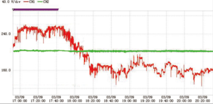 低電壓治理效果:紅色為輸入電壓(治理前電壓),綠色為輸出電壓(治理后電壓)。治理前電壓最高近250V,最低140V,電壓波動頻繁,治理后電壓一直穩定在220V左右,治理效果明顯。